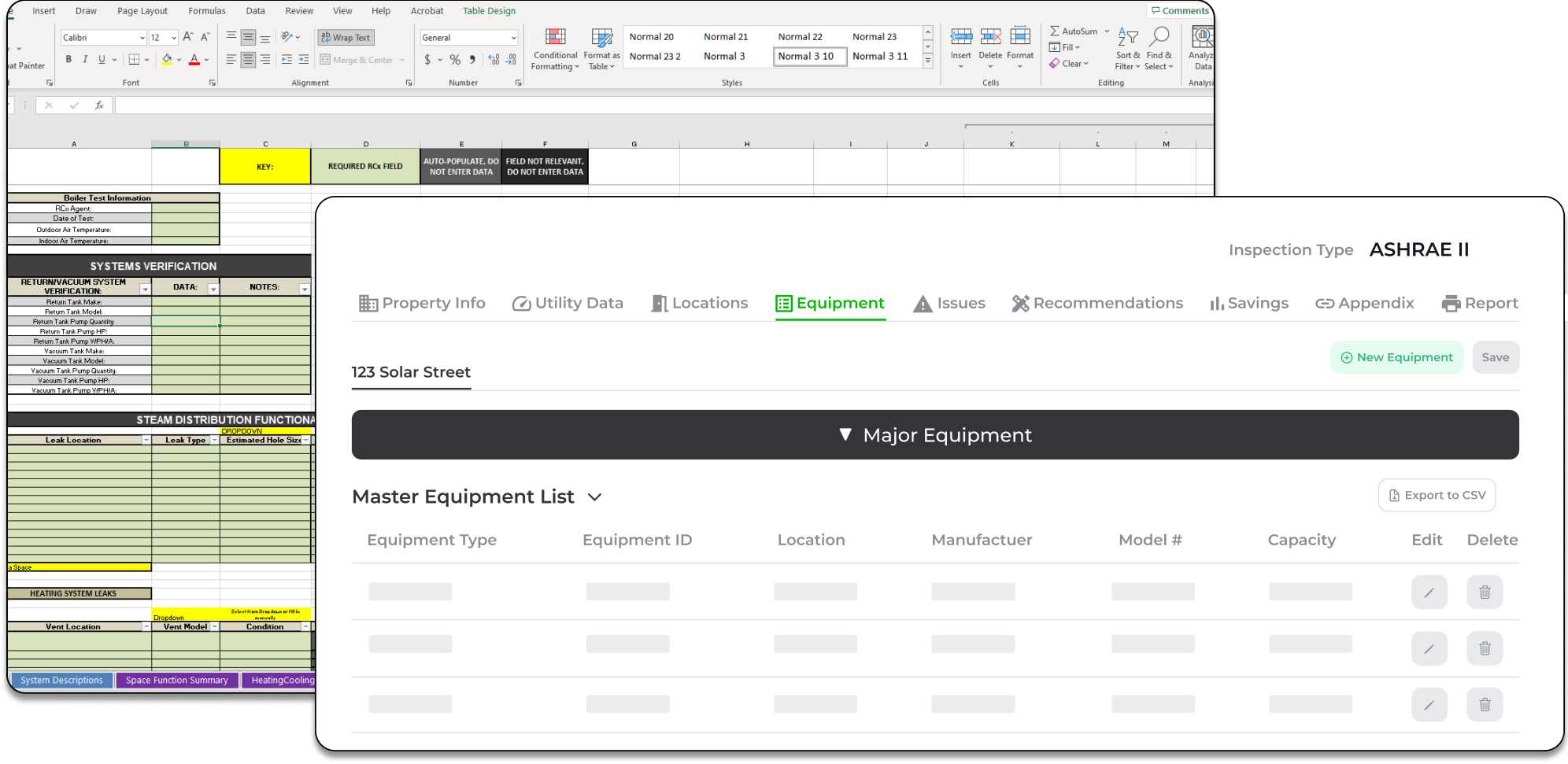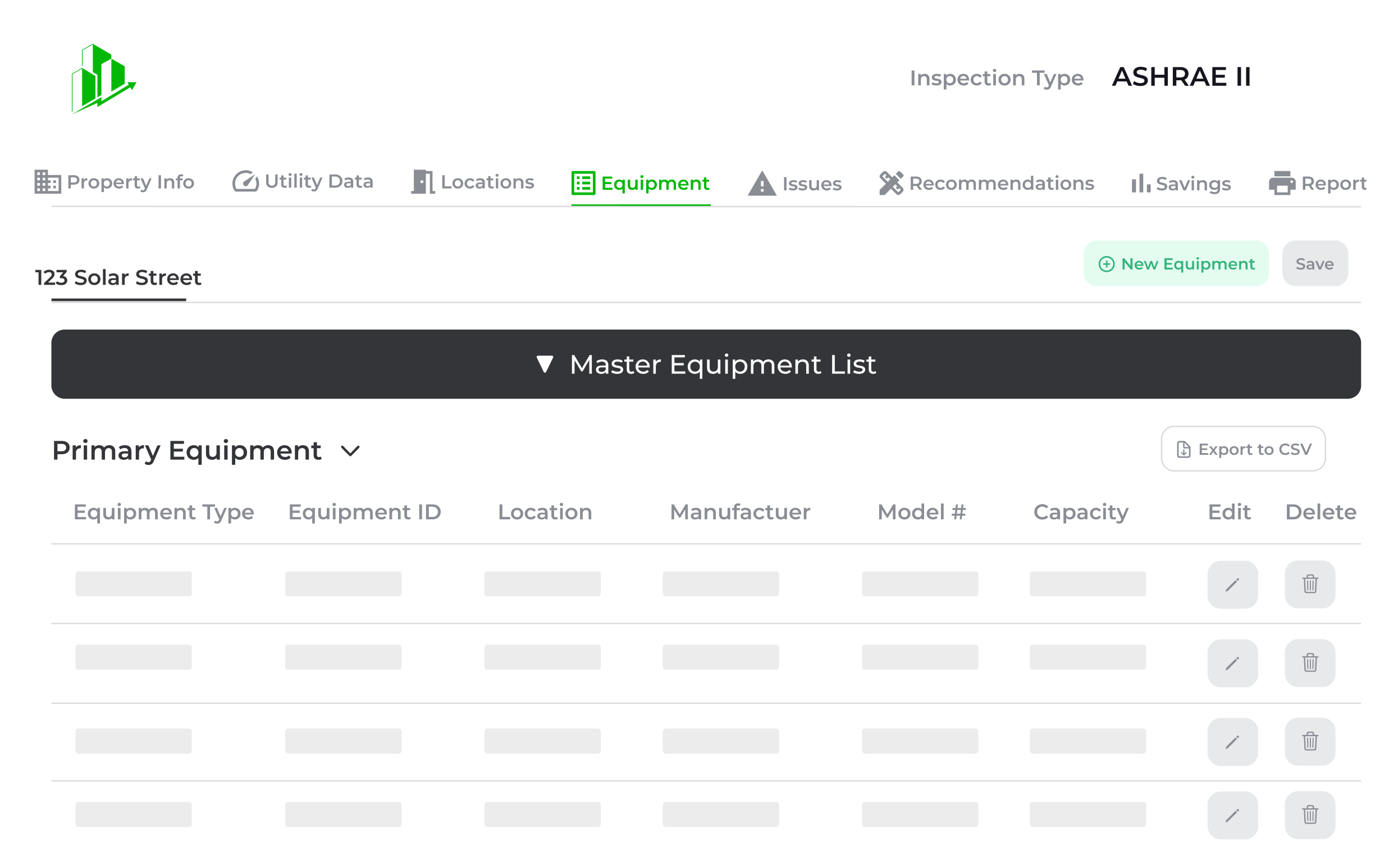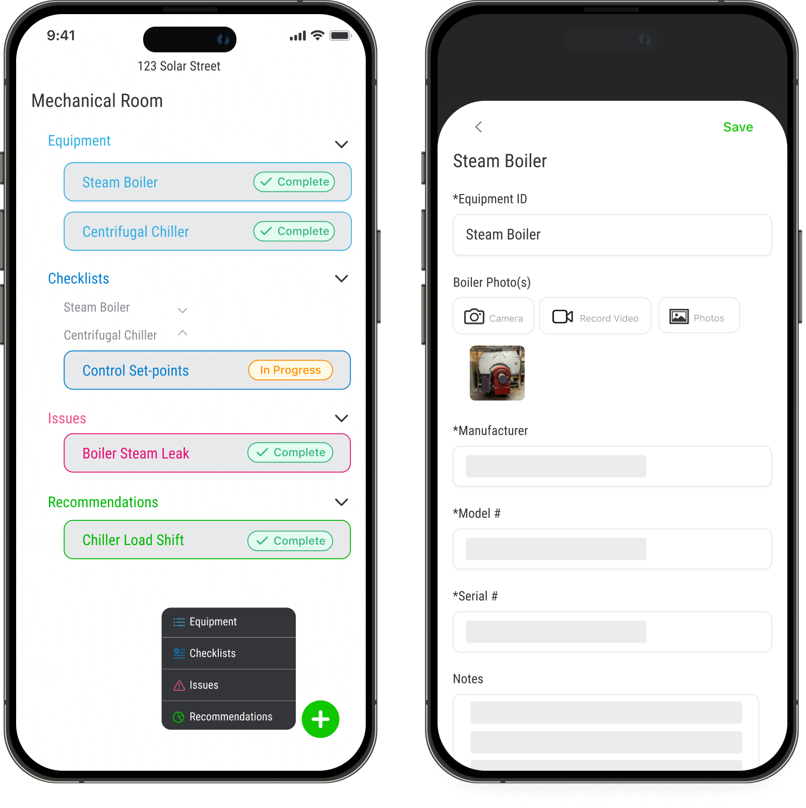 Properties, buildings, rooms, equipment and checklists are organized for streamlined data entry.